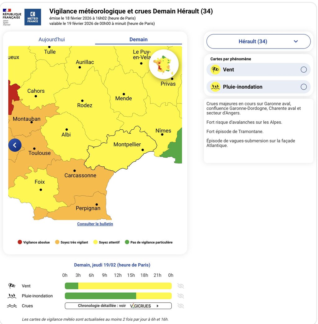 Météo-France place le département de l’#Hérault en vigilance jaune vent violents et pluie-inondation pour le jeudi 19 février 2026.