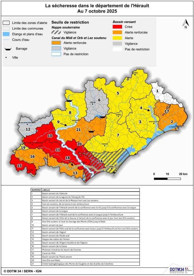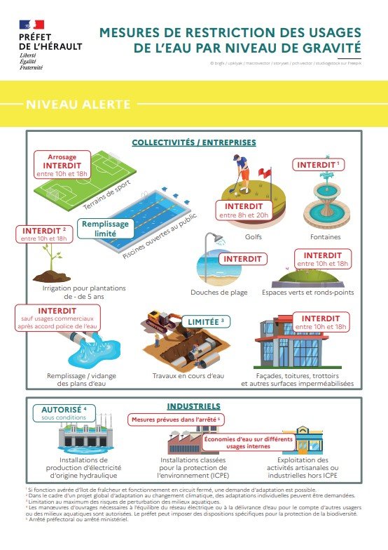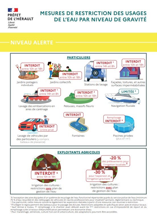 Pour connaître le niveau de restriction applicable à chaque commune, les habitants et les professionnels peuvent consulter la carte interactive RestrEau 34, disponible sur le site de la préfecture de l’Hérault.