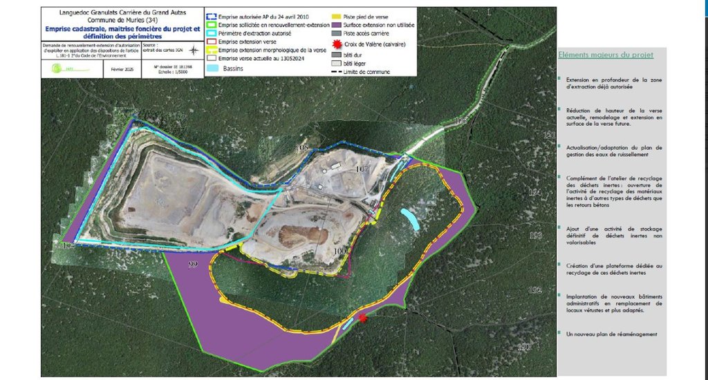 Pour rappel la consultation publique portant sur la demande d’autorisation environnementale présentée par la société Languedoc Granulat, en vue d’obtenir, au titre de la législation des installations classées pour la protection de l’environnement (ICPE), le renouvellement et l’extension d’autorisation d’exploiter la carrière lieu-dit "Grand Autas" et la création d’une installation de déchets inertes sur la commune de Murles (34980), est toujours en cours.