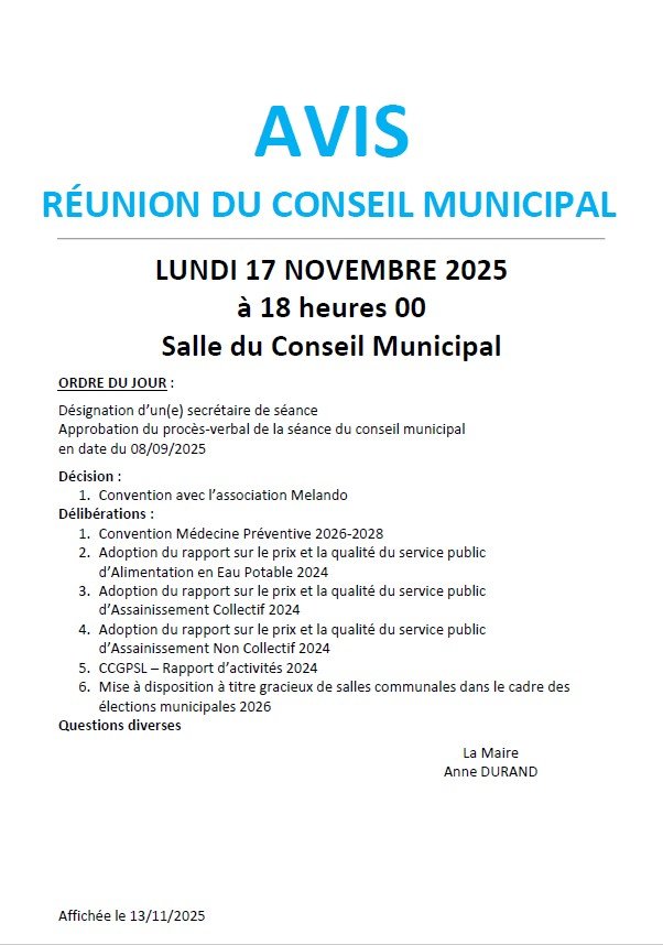 Le Conseil Municipal se réunira le lundi 17 novembre 2025 à 18 heures, salle du Conseil Municipal en Mairie.