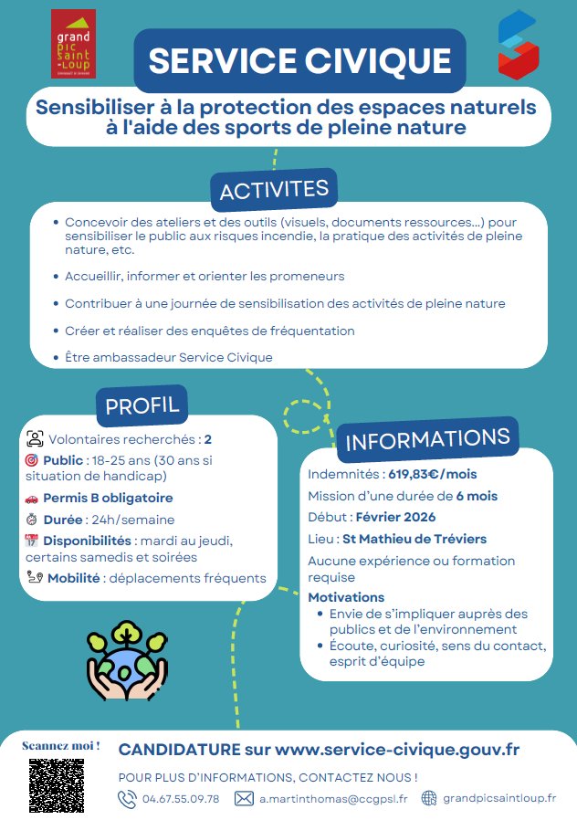 ► La Communauté de communes du Grand Pic Saint-Loup recherche deux volontaires en Service Civique pour une mission dédiée à la sensibilisation du grand public à la préservation de la biodiversité, à travers des activités de pleine nature.