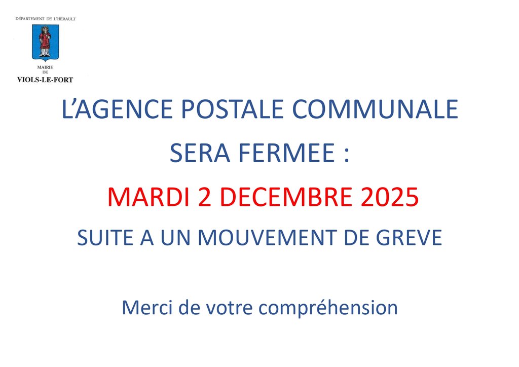 L'Agence Postale Communale sera exceptionnellement fermée le mardi 2 décembre 2025