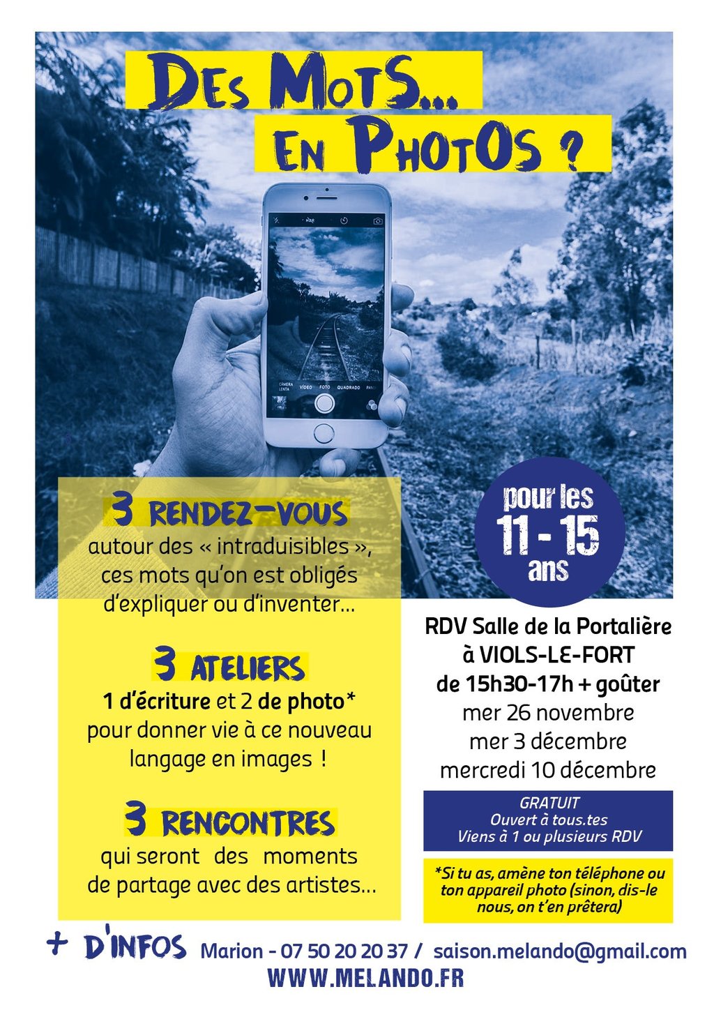 Dans la continuité de la projection organisée le 8 octobre dernier (merci d'y être venu d'ailleurs !), l'association MELANDO vous propose un atelier d'écriture et jeux linguistiques et deux ateliers-photo.