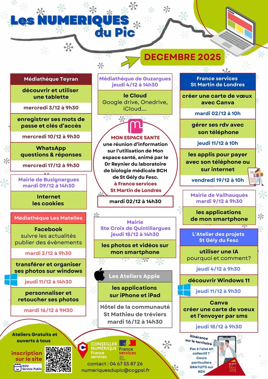 Votre espace France Services du Grand Pic Saint-Loup vous propose ses ateliers numériques pour le mois de décembre.