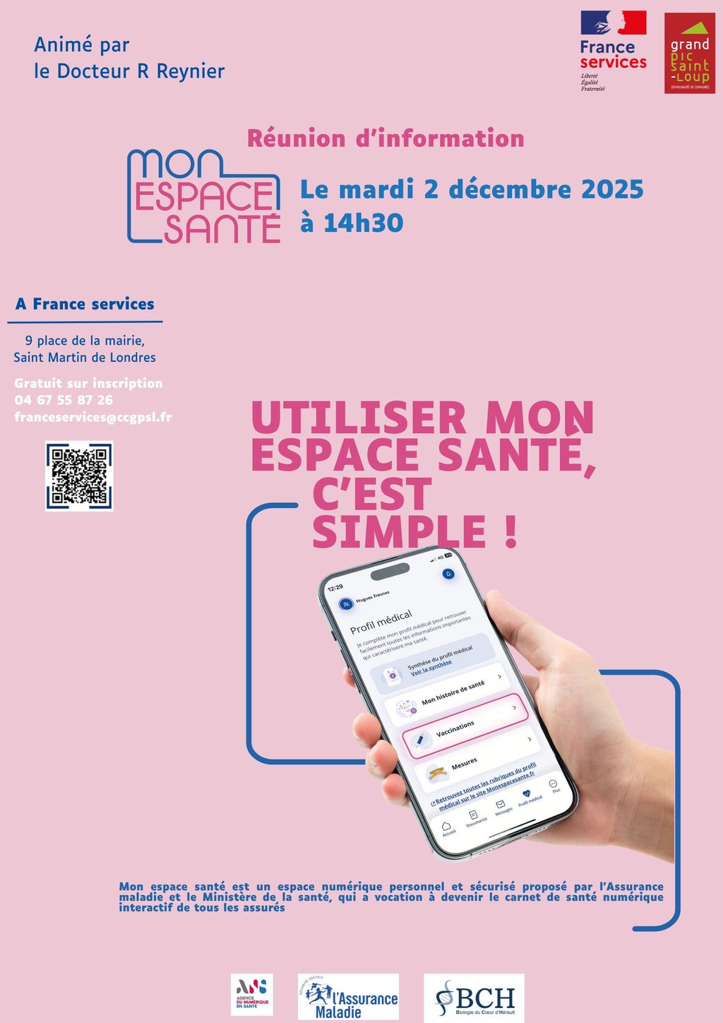 France Services organise une réunion d’information sur l’utilisation de Mon espace santé, animé par le Dr Reynier du laboratoire de biologie médicale BCH de St Gély du Fesc, le mardi 2 décembre 2025 à 14h30, dans ses locaux à Saint Martin de Londres.